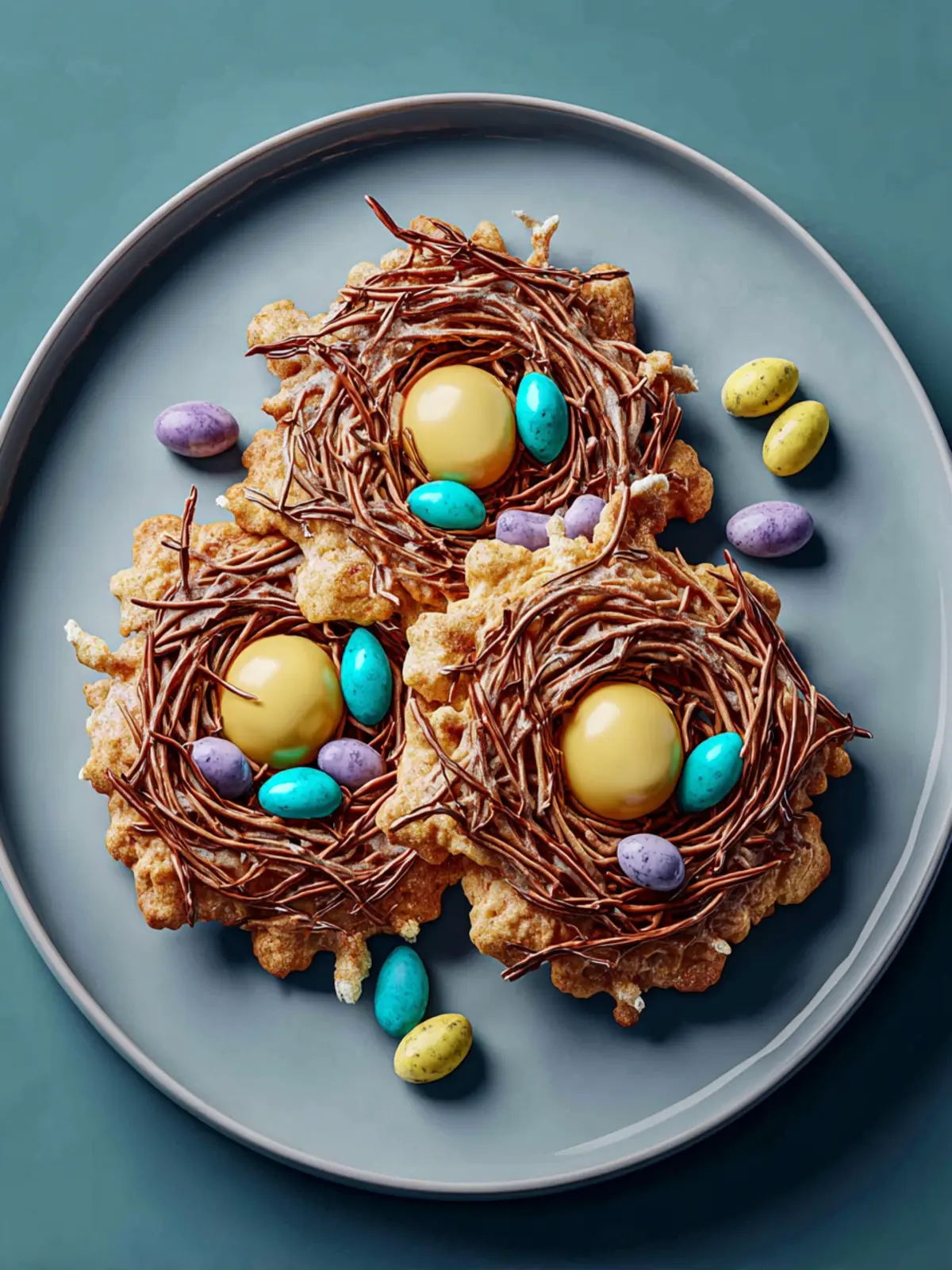 - Place candy eggs in the center of each nest.
