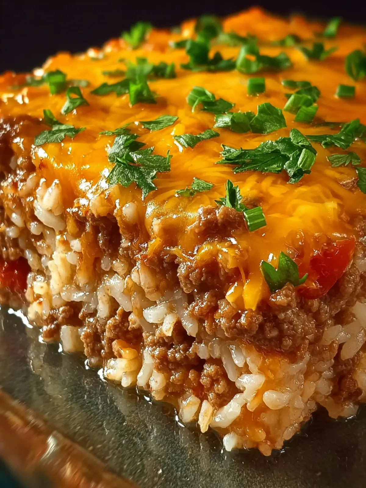 A comforting cheesy baked dish featuring ground beef and rice, topped with melted cheese and green onions.