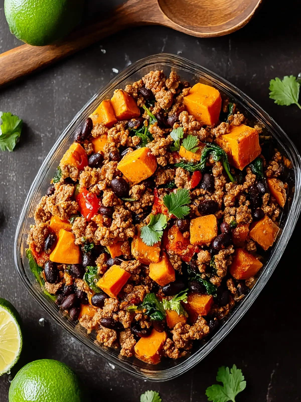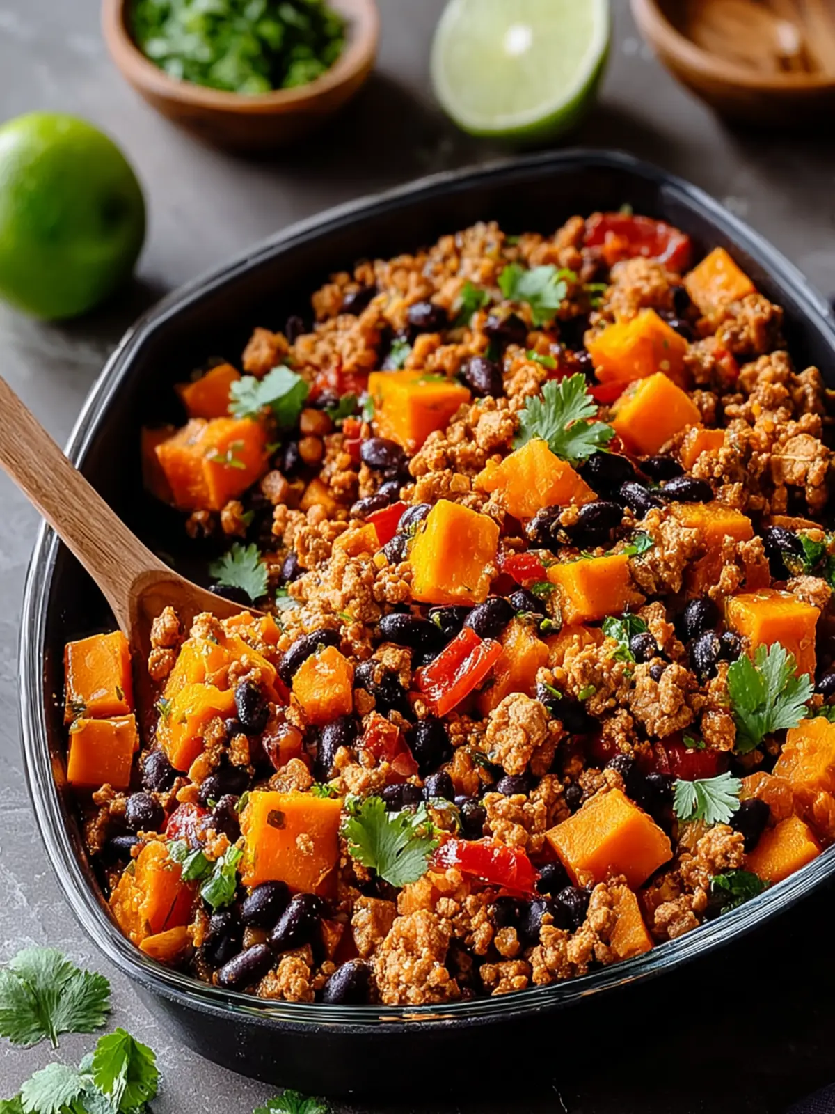 A hearty and healthy dish made with ground turkey, sweet potatoes, black beans, and spices.