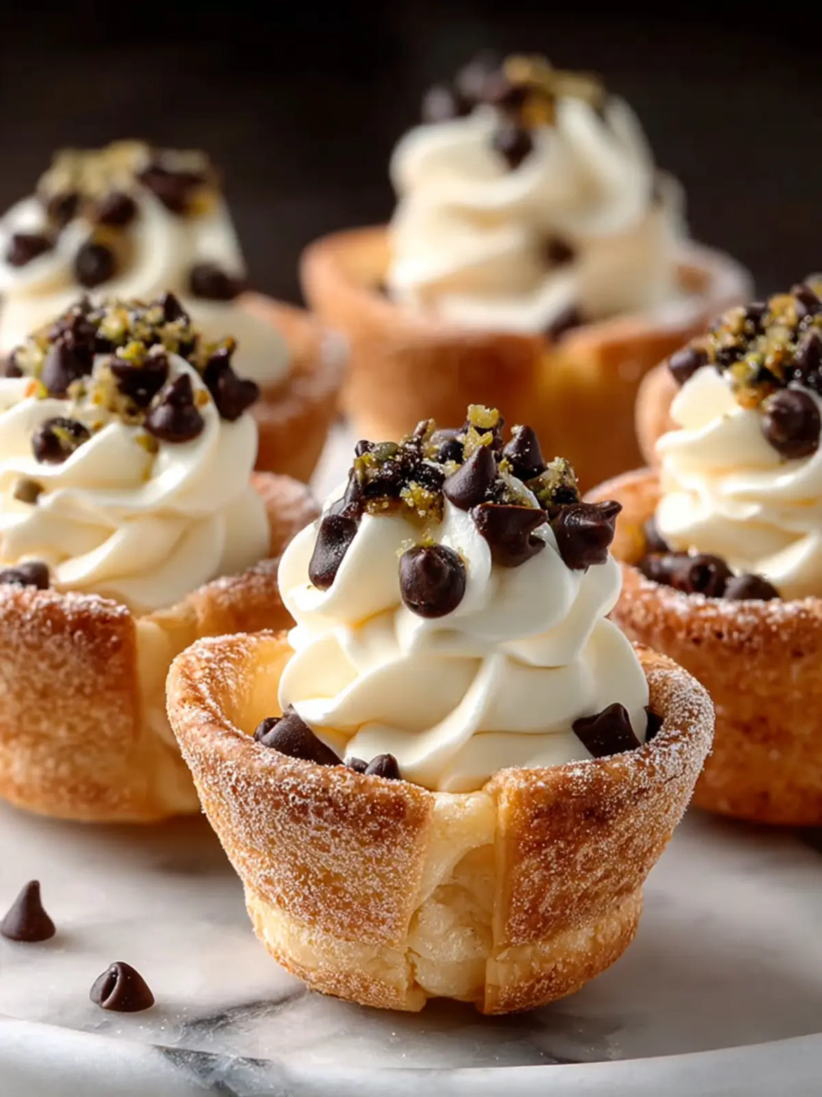Delicious mini pastry shells filled with a sweet ricotta mixture and topped with chocolate chips.