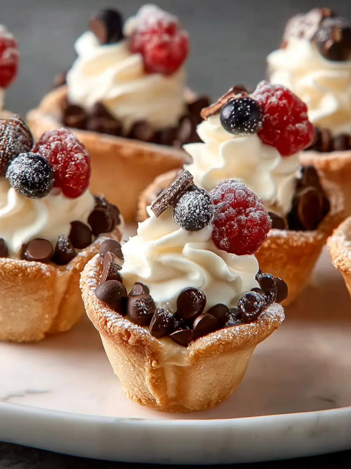 - Top each filled shell with remaining chocolate chips and a light dusting of powdered sugar.