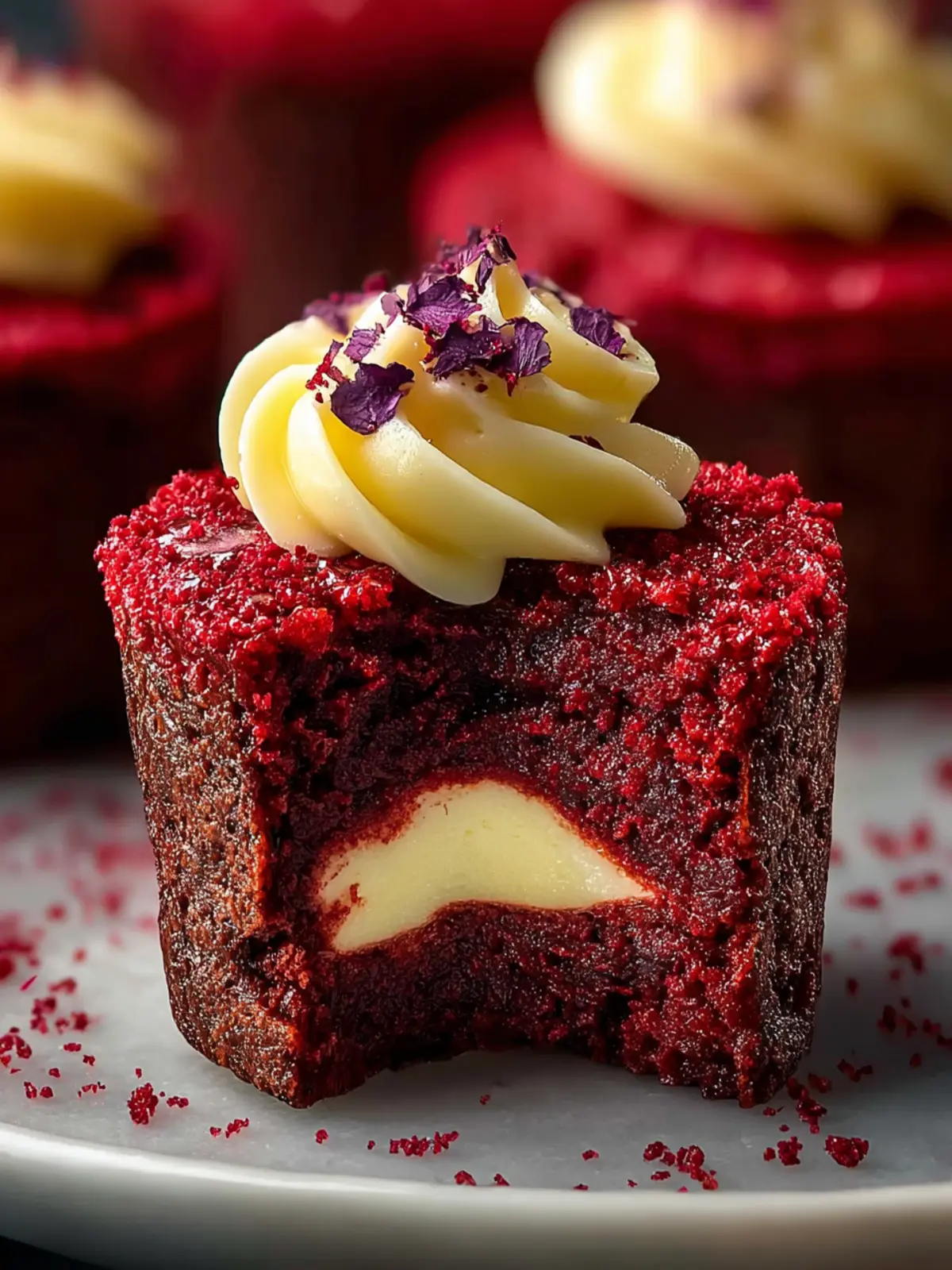 Deliciously rich and vibrant red velvet mini muffins filled with a creamy center.