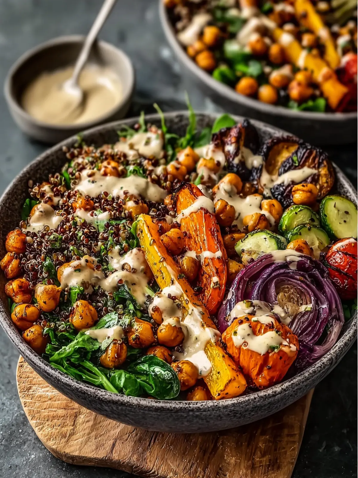 This Roasted Vegetable Quinoa Bowl is a healthy and delicious meal packed with flavor from roasted veggies and a creamy tahini dressing.