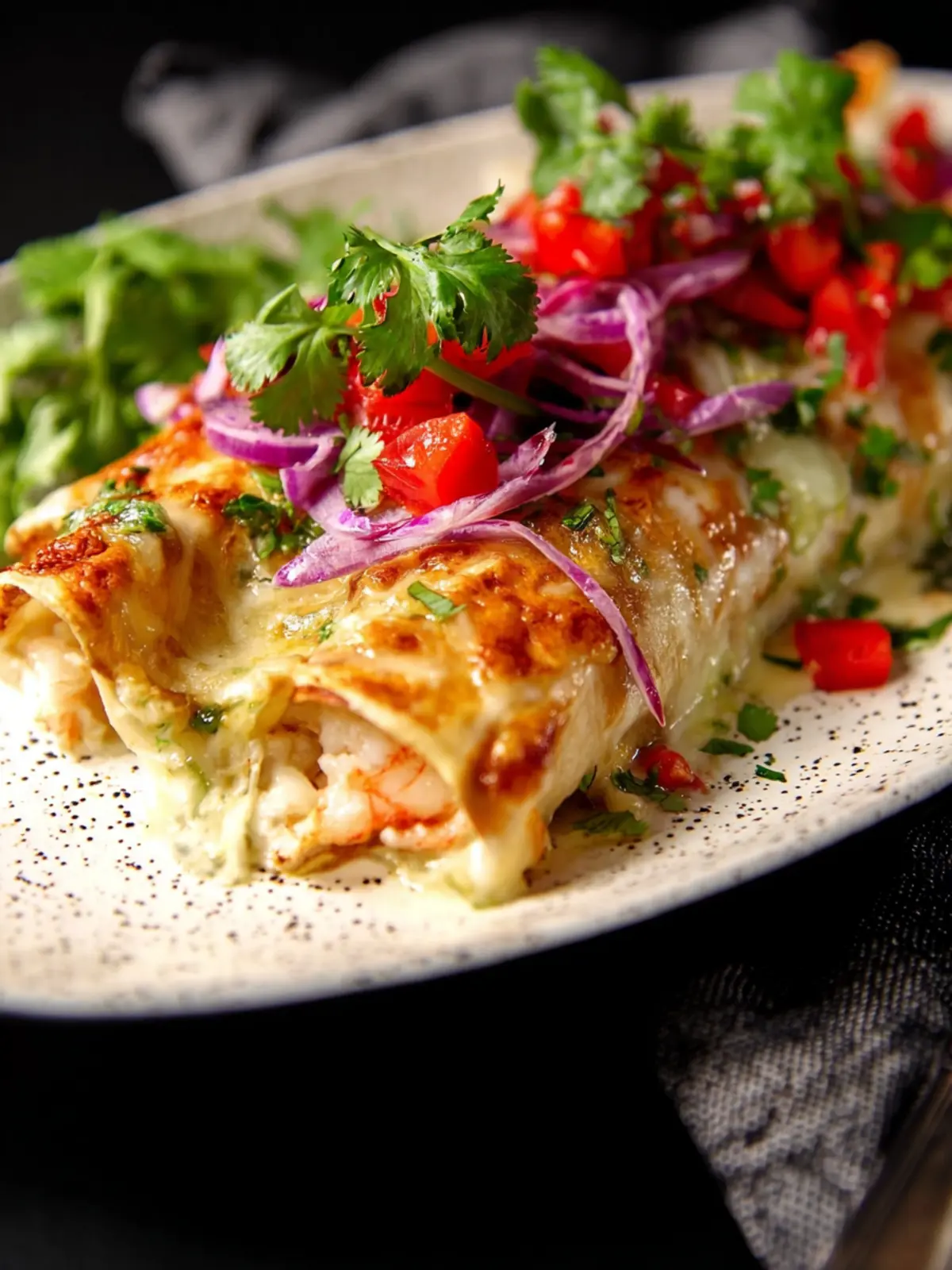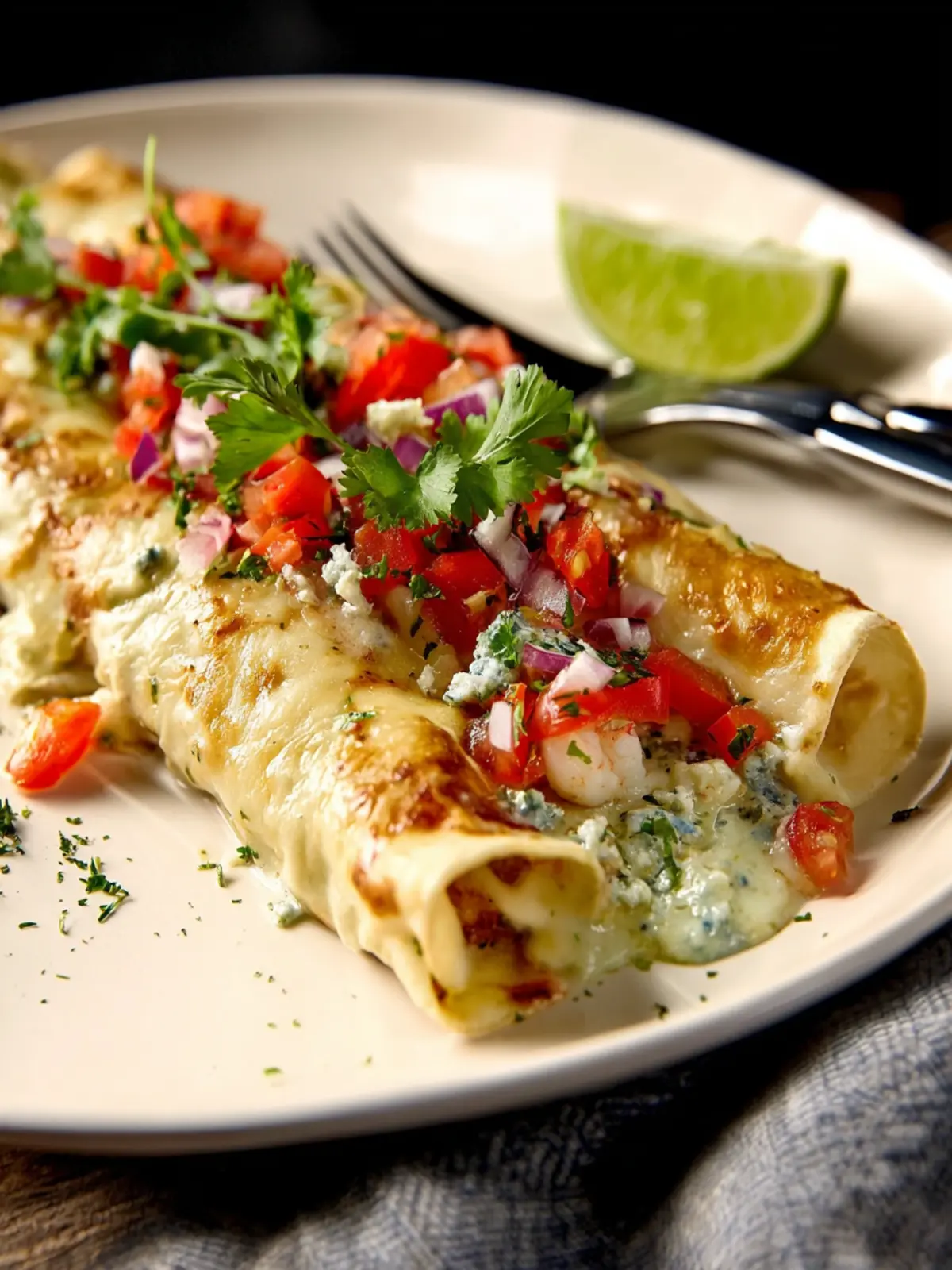 Delicious enchiladas filled with shrimp, crab, and cheese, topped with a creamy salsa verde sauce.