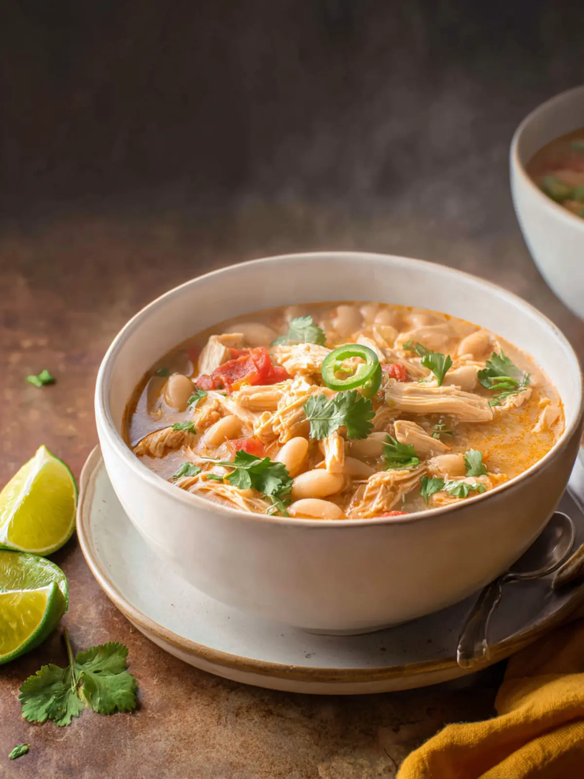 A comforting and hearty chicken chili made with white beans, corn, and spices.